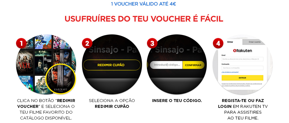 Importante: · O código do voucher é válido até um valor de 4€ de crédito e um filme em SD, até 13 de agosto de 2017. · Poderás assistir ao filme até no máximo 48 horas após redimires o voucher. · Uma vez redimido o voucher, podes assistir ao filme online ou em qualquer Wuaki.tv app, nos seguintes dispositivos: LG Smart TVs 2012-2014, IOS, Android and Chromecast. · Basta efetuares o login com o teu email e password de registo na Wuaki.tv. Podes verificar a lista de dispositivos disponíveis aquí. · Para mais informações sobre a campanha, contacta a Linha de Apoio à campanha, através do número 218 941 274 (Dias úteis: 9h-13h e 14h-18h). |